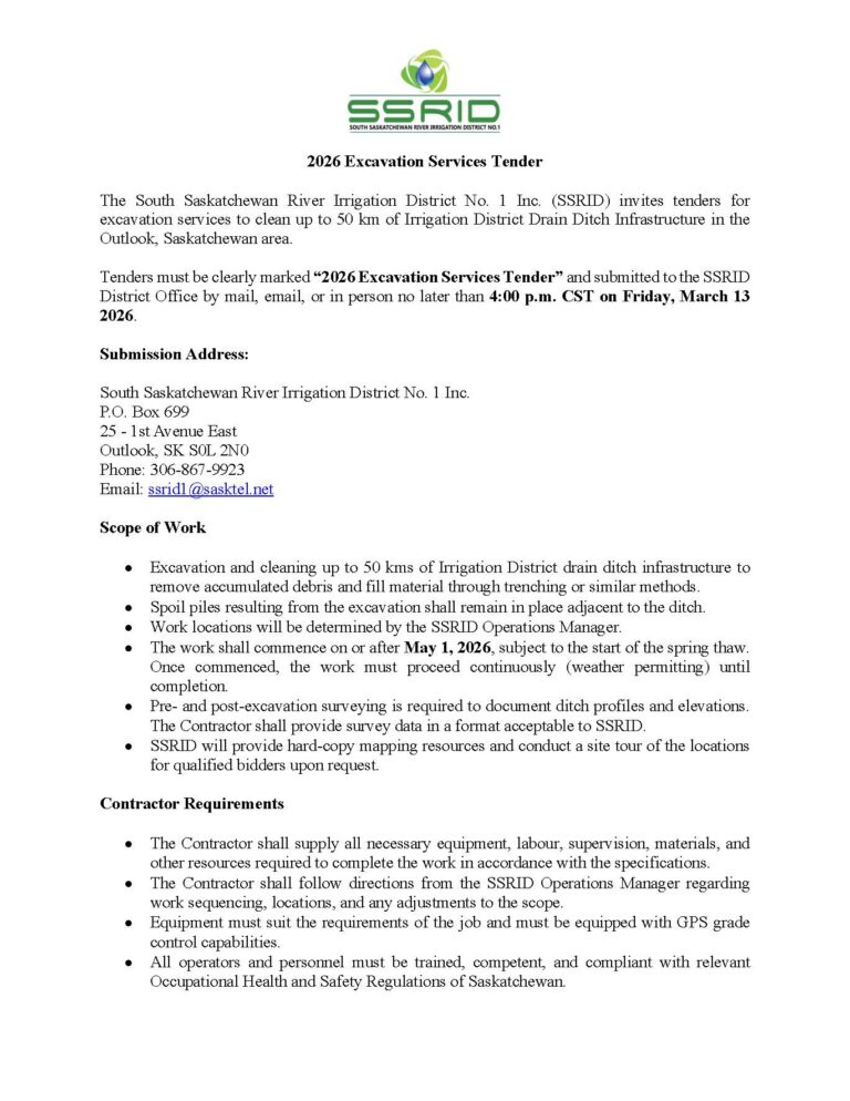 We are the LARGEST irrigation district in Saskatchewan with 41,000 irrigated acres that are supplied from Lake Diefenbaker with over 485 km of canals, laterals and drains.